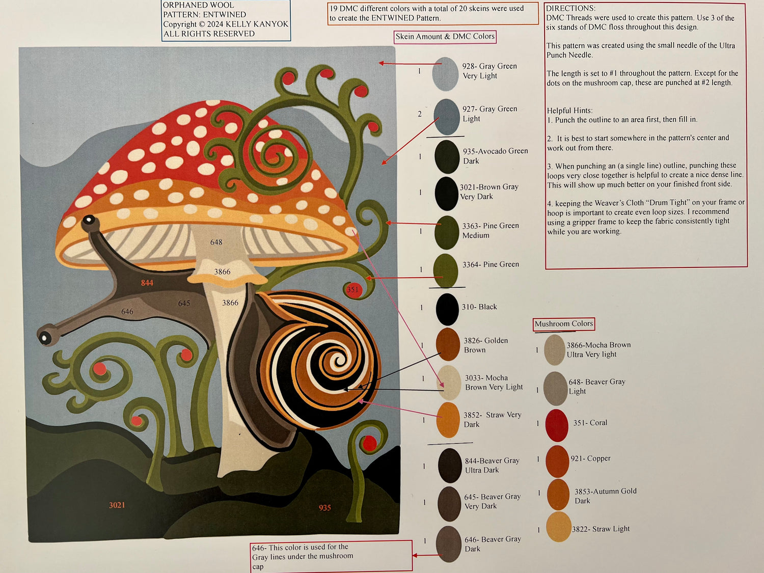 The Orphaned Wool Punch Needle Color Guide features a full-color illustration of the design, the type of thread used, color codes, thread quantities, and placement details. Helpful hints and instructions are also provided to guide your project.