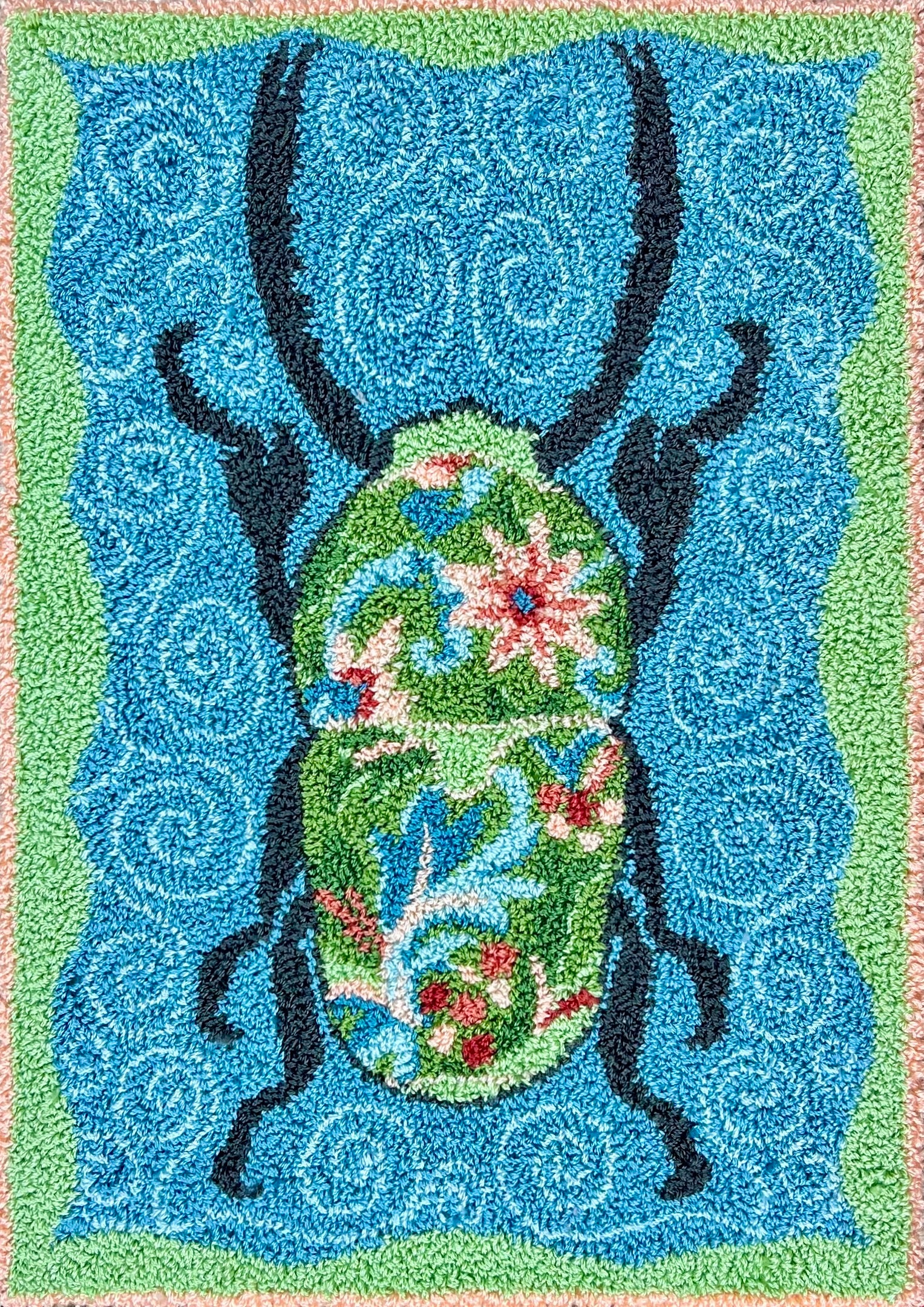 Add a playful, nature-inspired accent to your home with the Beetle In Bloom Rug Hooking Pattern. This whimsical design features a vibrant green beetle adorned with florals on a turquoise background, perfect for fiber artists who love colorful nature designs.